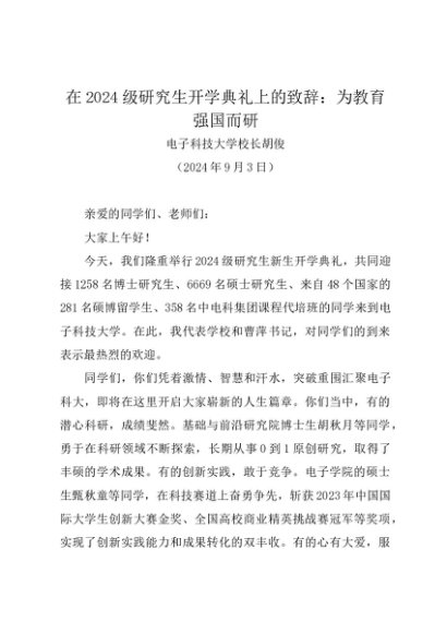 / 领导讲话:20240903在2024级研究生开学典礼上的致辞:为教育强国而研——电子科技大学校长胡俊