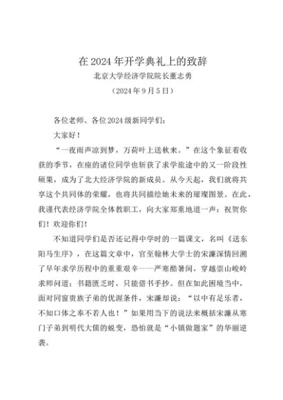 / 领导讲话:20240905在2024年开学典礼上的致辞——北京大学经济学院院长董志勇