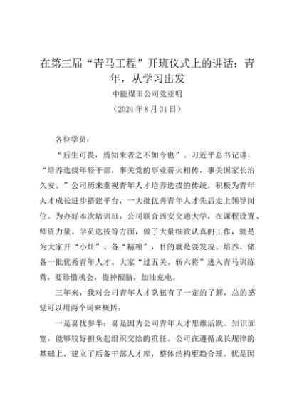 / 领导讲话:20240831在第三届“青马工程”开班仪式上的讲话:青年,从学习出发——中能煤田公司党亚明