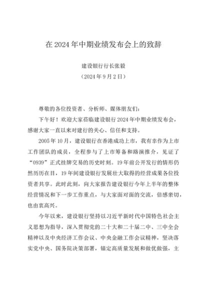 / 领导讲话:20240902在2024年中期业绩发布会上的致辞——建设银行行长张毅