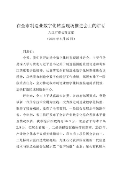 / 领导讲话:20240827在全市制造业数字化转型现场推进会上的讲话——九江市市长蒋文定