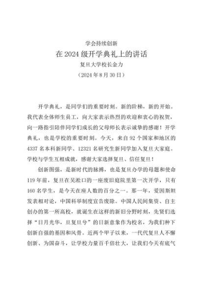 / 领导讲话:20240830在2024级开学典礼上的讲话——复旦大学校长金力