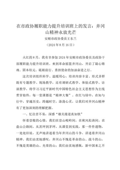 / 领导讲话:20240816在市政协履职能力提升培训班上的发言:井冈山精神永放光芒——安顺市政协委员王东兰
