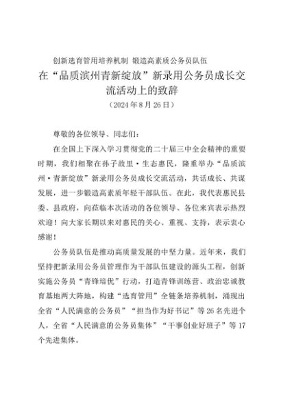 / 领导讲话:20240826在“品质滨州青新绽放”新录用公务员成长交流活动上的致辞