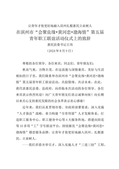 / 领导讲话:20240809在滨州市“会聚良缘•黄河恋•渤海情”第五届青年职工联谊活动仪式上的致辞——惠民县委书记王玮