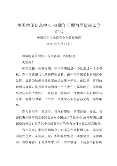 / 领导讲话:20240811中国纺织信息中心60周年回顾与展望座谈会讲话——中国纺织工业联合会会长孙瑞哲