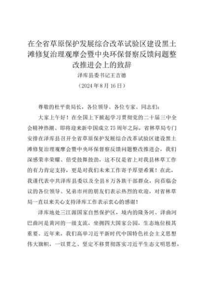 领导讲话:20240816在全省草原保护发展综合改革试验区建设黑土滩修复治理观摩会暨中央环保督察反馈问题整改推进会上的致辞——泽库县委书记王吉德