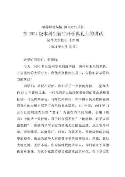 / 领导讲话:20240815在2024级本科生新生开学典礼上的讲话——清华大学校长 李路明