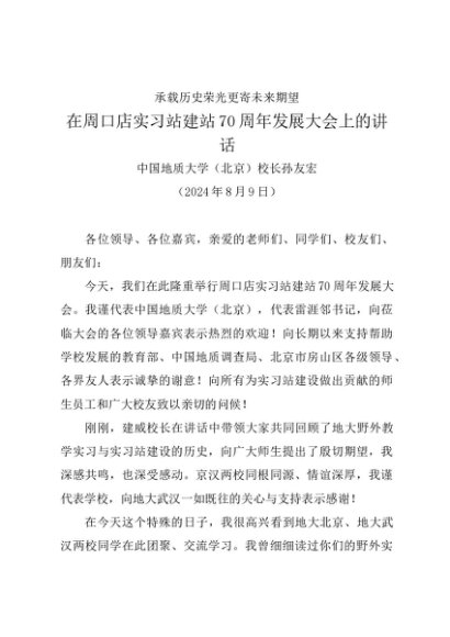 / 领导讲话:20240809在周口店实习站建站70周年发展大会上的讲话——中国地质大学(北京)校长孙友宏