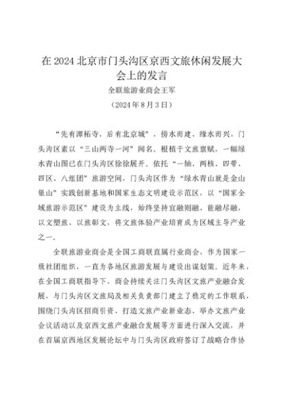 / 领导讲话:20240803在2024北京市门头沟区京西文旅休闲发展大会上的发言——全联旅游业商会王军