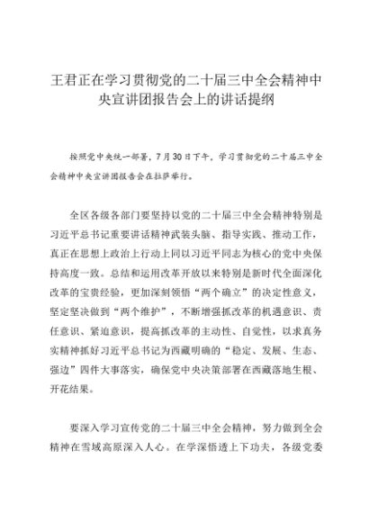 / 领导讲话:20240730王君正在学习贯彻党的二十届三中全会精神中央宣讲团报告会上的讲话提纲