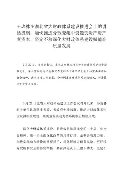 领导讲话:20240730王忠林在湖北省大财政体系建设推进会上的讲话提纲:加快推进分散变集中资源变资产资产变资本,坚定不移深化大财政体系建设赋能高质量发展