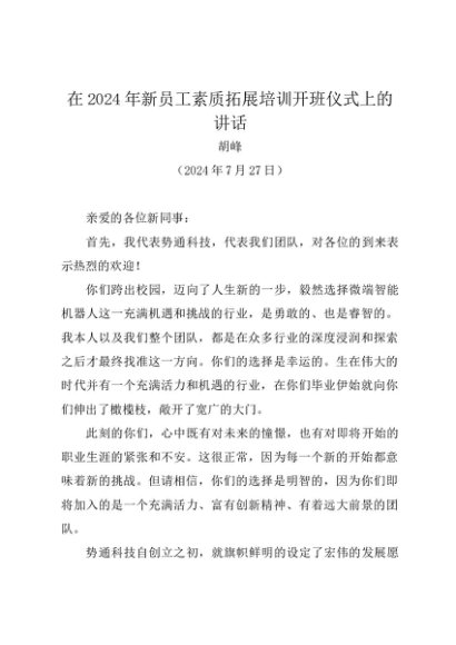 / 领导讲话:20240727在2024年新员工素质拓展培训开班仪式上的讲话