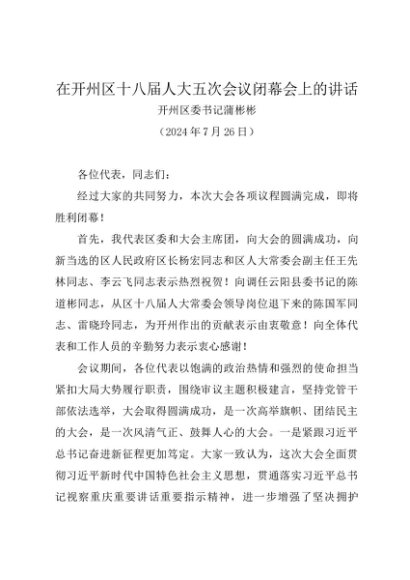 / 领导讲话:20240726在开州区十八届人大五次会议闭幕会上的讲话——开州区委书记蒲彬彬