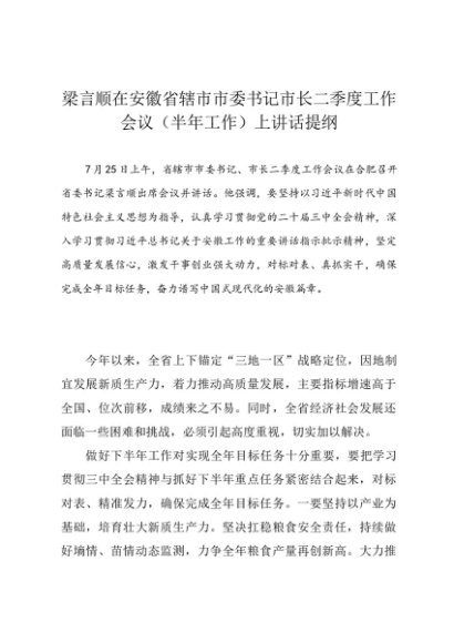 / 领导讲话:20240725梁言顺在安徽省辖市市委书记市长二季度工作会议(半年工作)上讲话提纲