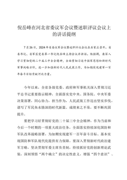/ 领导讲话:20240726倪岳峰在河北省委议军会议暨述职评议会议上的讲话提纲