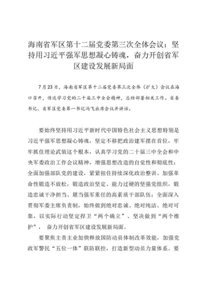 领导讲话:20240723海南省军区第十二届党委第三次全体会议:坚持用习近平强军思想凝心铸魂,奋力开创省军区建设发展新局面