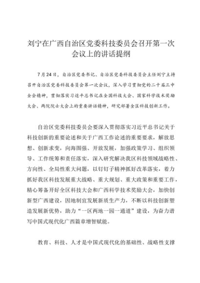 领导讲话:20240724刘宁在广西自治区党委科技委员会召开第一次会议上的讲话提纲