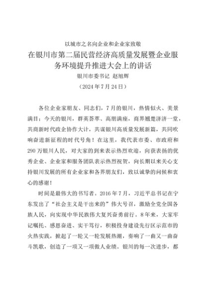 / 领导讲话:20240724在银川市第二届民营经济高质量发展暨企业服务环境提升推进大会上的讲话——银川市委书记 赵旭辉
