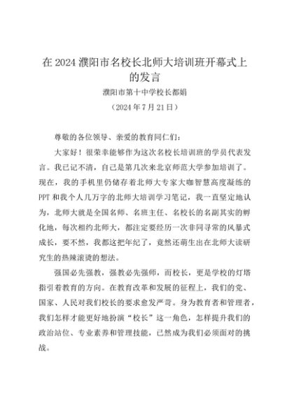 / 领导讲话:20240721在2024濮阳市名校长北师大培训班开幕式上的发言——濮阳市第十中学校长都娟