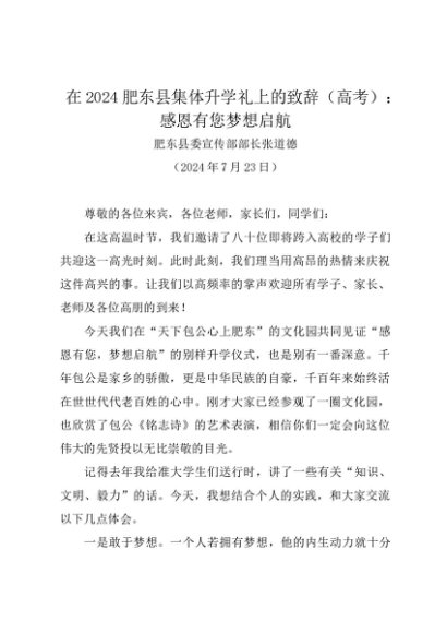 / 领导讲话:20240723在2024肥东县集体升学礼上的致辞(高考):感恩有您梦想启航——肥东县委宣传部部长张道德