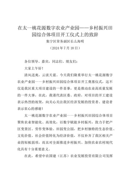 / 领导讲话:20240718在太一桃花源数字农业产业园——乡村振兴田园综合体项目开工仪式上的致辞——集宁区常务副区长么海明