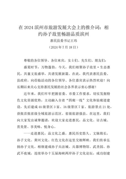 / 领导讲话:20240718在2024滨州市旅游发展大会上的推介词:相约孙子故里畅游品质滨州——惠民县委书记王玮