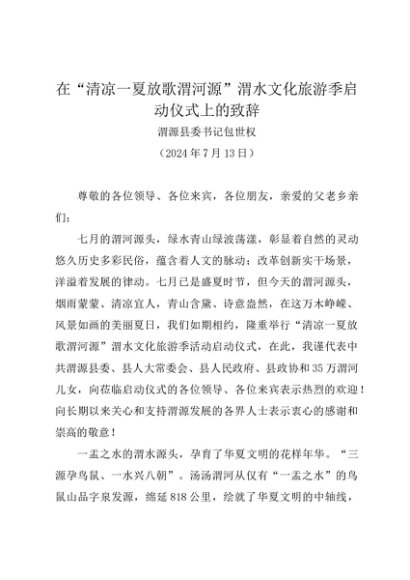 / 领导讲话:20240713在“清凉一夏放歌渭河源”渭水文化旅游季启动仪式上的致辞——渭源县委书记包世权