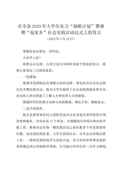 / 领导讲话:20240719在全县2024年大学生实习“扬帆计划”暨暑期“返家乡”社会实践启动仪式上的发言