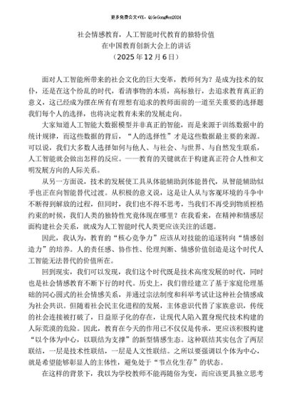 领导讲话:20251215在中国教育创新大会上的讲话:社会情感教育,人工智能时代教育的独特价值