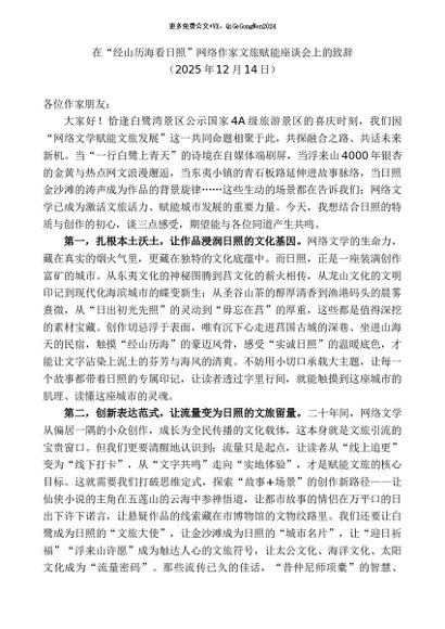 / 领导讲话:20251215在“经山历海看日照”网络作家文旅赋能座谈会上的致辞