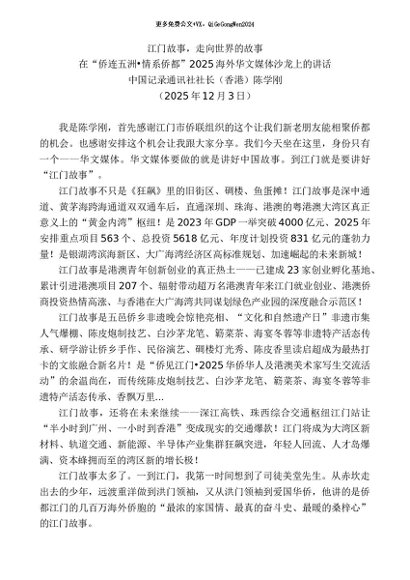/ 领导讲话:20251215中国记录通讯社社长(香港)陈学刚:在“侨连五洲 情系侨都”2025海外华文媒体沙龙上的讲话