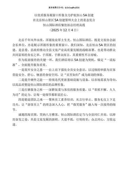 / 领导讲话:20251215恒山国际酒店餐饮部总经理高霞:在北岳恒山景区5A创建誓师大会上的表态发言