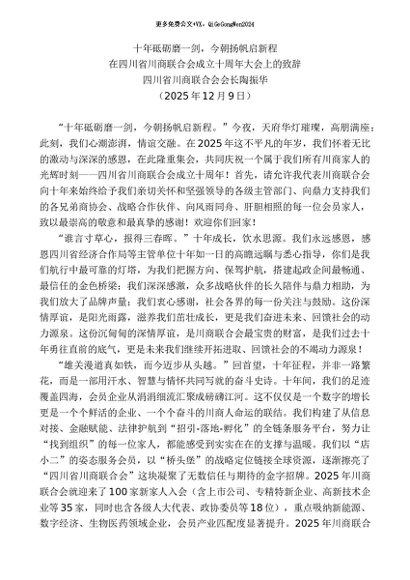 / 领导讲话:20251215四川省川商联合会会长陶振华:在四川省川商联合会成立十周年大会上的致辞