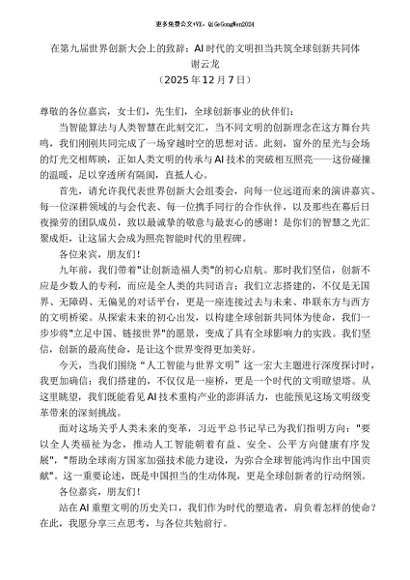 / 领导讲话:20251215谢云龙:在第九届世界创新大会上的致辞:AI时代的文明担当共筑全球创新共同体