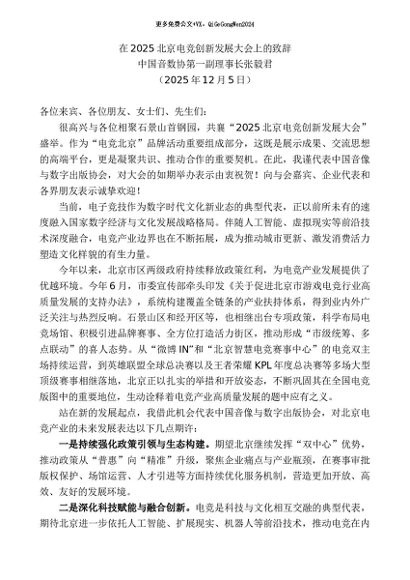 / 领导讲话:20251215中国音数协第一副理事长张毅君:在2025北京电竞创新发展大会上的致辞