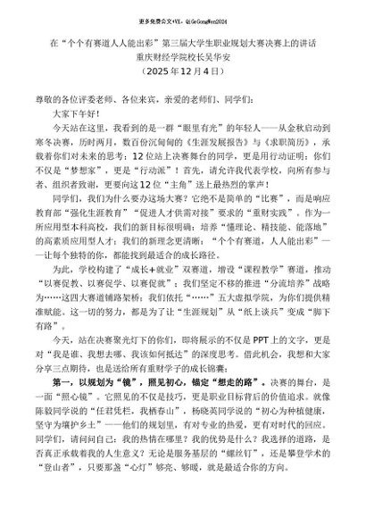 / 领导讲话:20251215重庆财经学院校长吴华安:在“个个有赛道人人能出彩”第三届大学生职业规划大赛决赛上的讲话