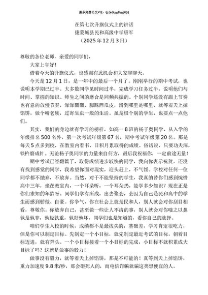 / 领导讲话:20251215捷蒙城县民和高级中学唐军:在第七次升旗仪式上的讲话