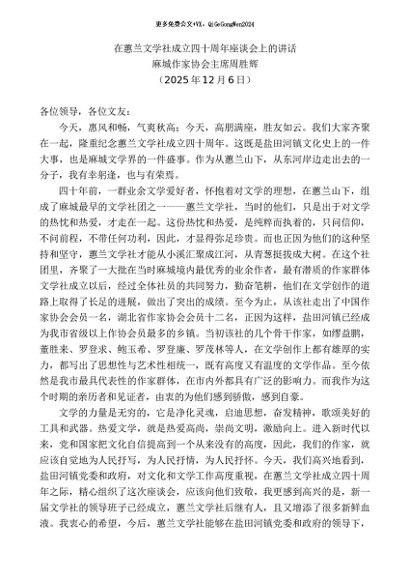 / 领导讲话:20251215麻城作家协会主席周胜辉:在蕙兰文学社成立四十周年座谈会上的讲话