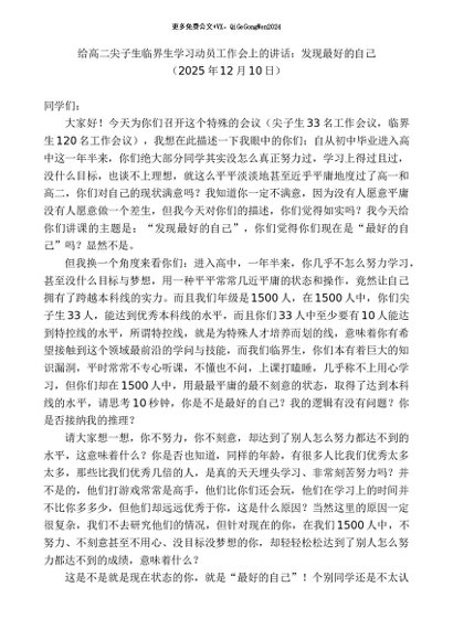 领导讲话:20251215给高二尖子生临界生学习动员工作会上的讲话:发现最好的自己
