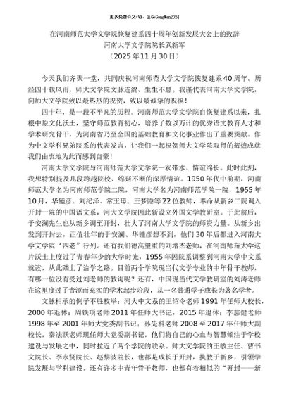 / 领导讲话:20251215河南大学文学院院长武新军:在河南师范大学文学院恢复建系四十周年创新发展大会上的致辞