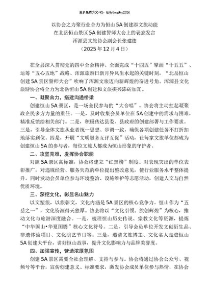 / 领导讲话:20251215浑源县文旅协会副会长张建德:在北岳恒山景区5A创建誓师大会上的表态发言