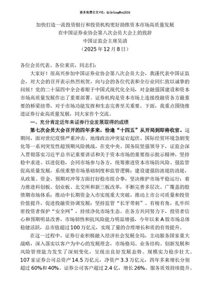 / 领导讲话:20251215中国证监会主席吴清在中国证券业协会第八次会员大会上的致辞
