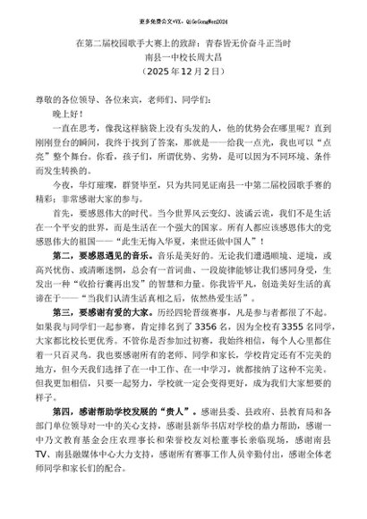 领导讲话:20251215南县一中校长周大昌:在第二届校园歌手大赛上的致辞:青春皆无价奋斗正当时