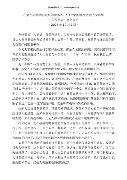 / 领导讲话:20251215中国作协副主席何建明:在第九届世界创新大会的致辞:人工智能创新要吸收人文思想
