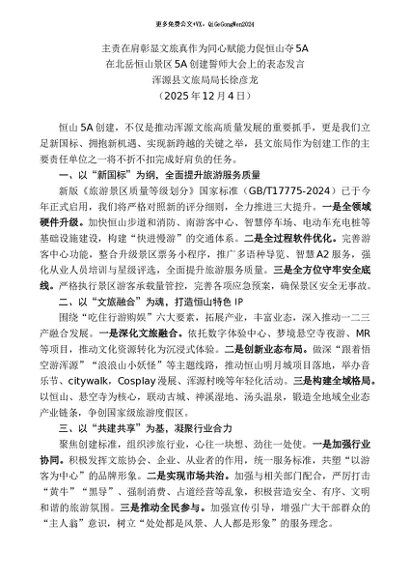 / 领导讲话:20251215浑源县文旅局局长徐彦龙:在北岳恒山景区5A创建誓师大会上的表态发言