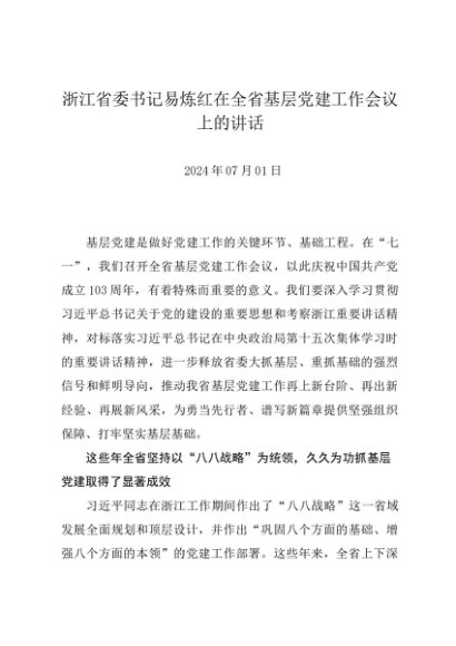 / 领导讲话:20240701浙江省委书记易炼红在全省基层党建工作会议上的讲话
