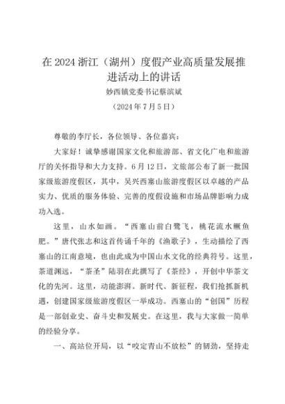 / 领导讲话:20240705在2024浙江(湖州)度假产业高质量发展推进活动上的讲话——妙西镇党委书记蔡滨斌