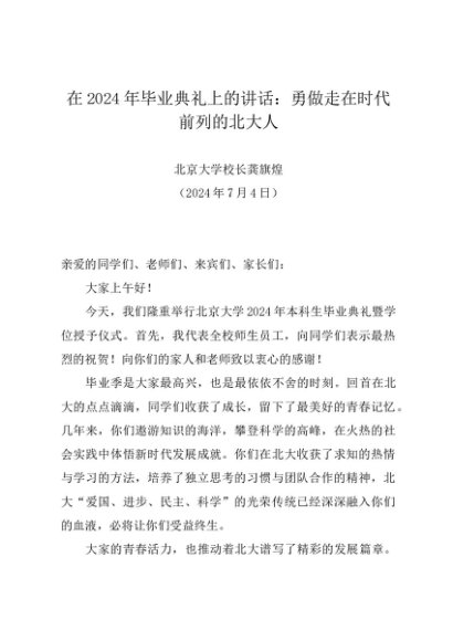 领导讲话:20240704在2024年毕业典礼上的讲话:勇做走在时代前列的北大人——北京大学校长龚旗煌