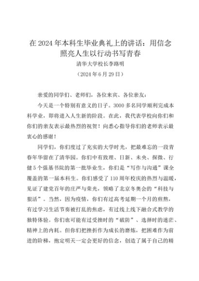 / 领导讲话:20240629在2024年本科生毕业典礼上的讲话:用信念照亮人生以行动书写青春——清华大学校长李路明